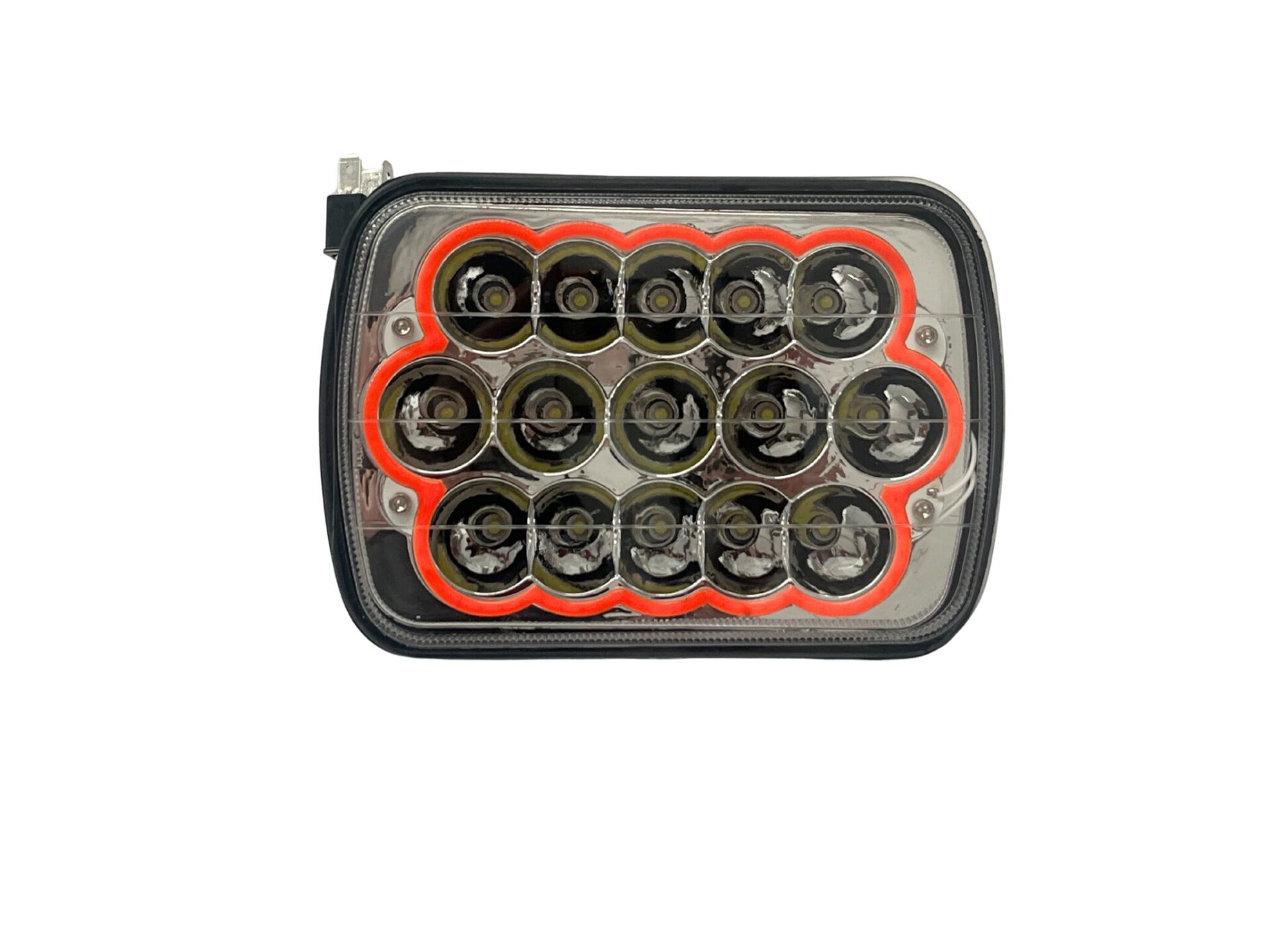 Luz exploradora tipo H4 de 8 pulgadas, equipada con 15 LEDs y potencia de 45W. Compatible con sistemas 12V y 24V (bivolt). Incorpora borde COB en color rojo para efecto decorativo y mayor presencia visual. Dimensiones aproximadas de 13×18 cm, ideal para vehículos de trabajo o uso off-road.