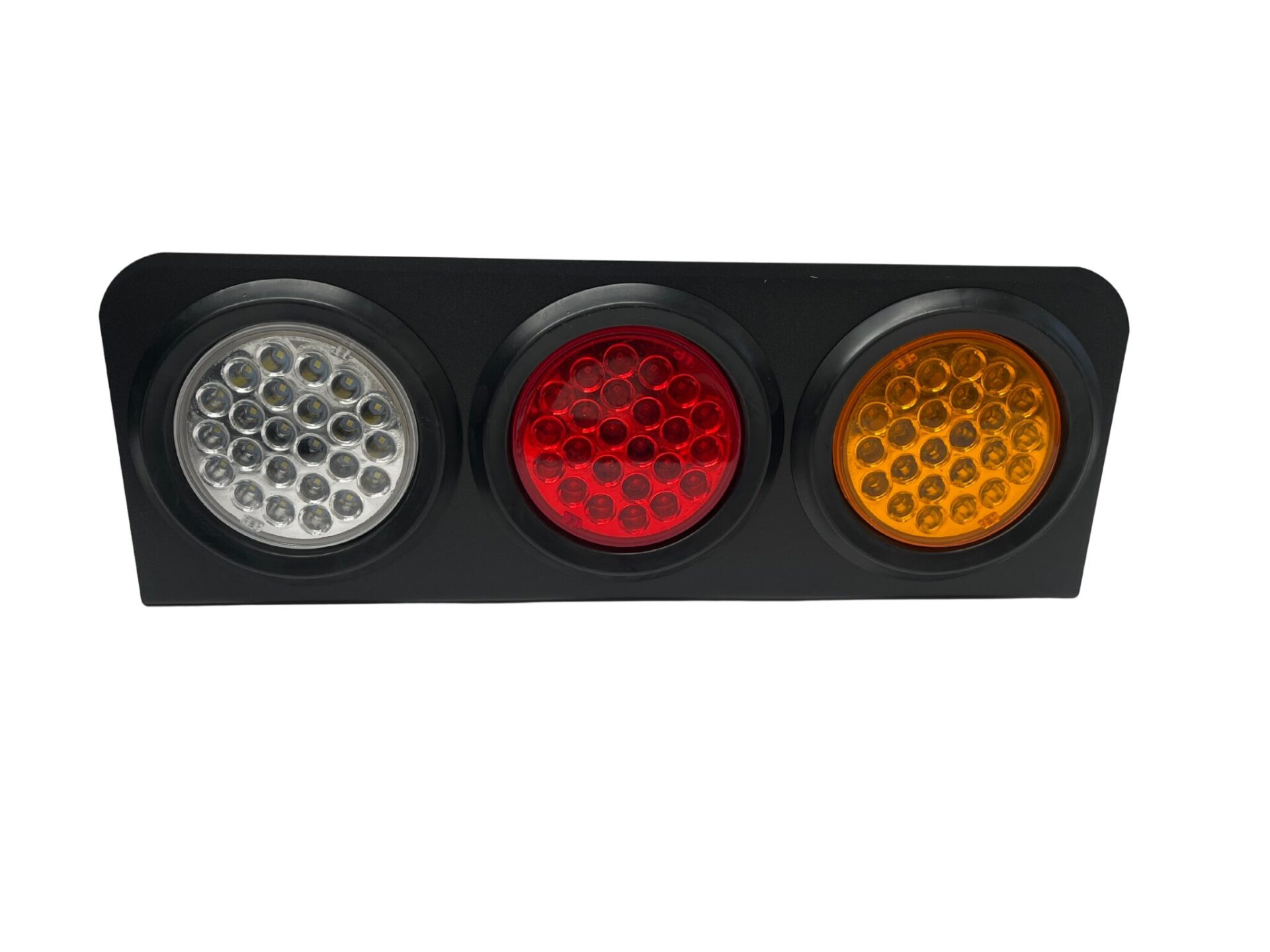 Stop LED redondo de 4 pulgadas con configuración triple función. Cuenta con base metálica en acabado negro que brinda mayor resistencia y firmeza en la instalación. Diseñado para señalización trasera en vehículos, ofreciendo buena visibilidad y bajo consumo energético